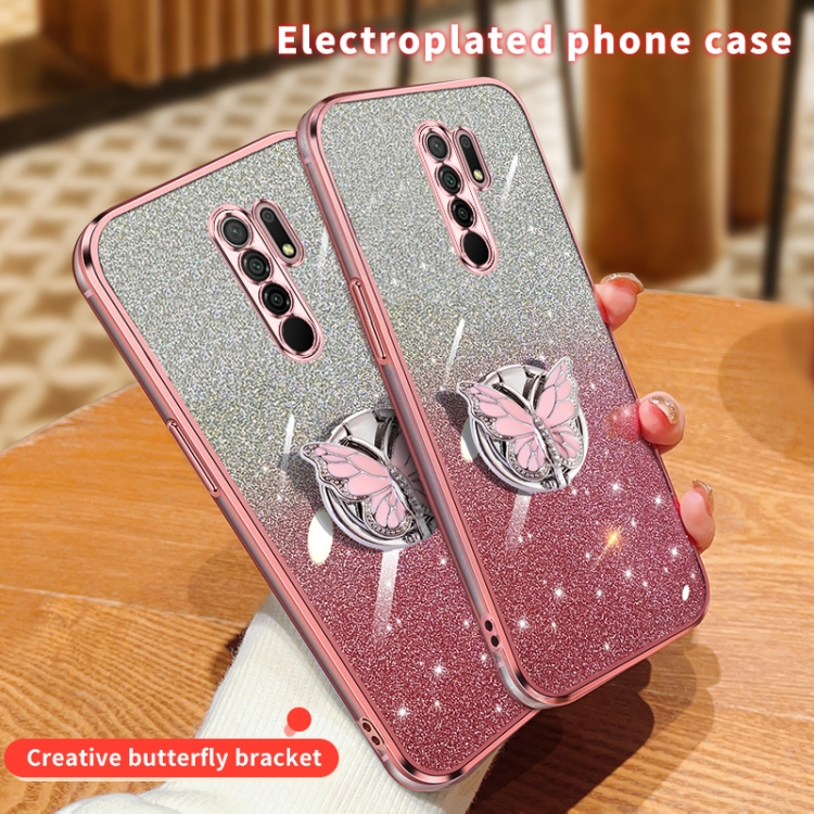 Para Redmi 9 Funda para Teléfono de TPU con Soporte de Mariposa con Brillo Degradado Plateado (Plata)
