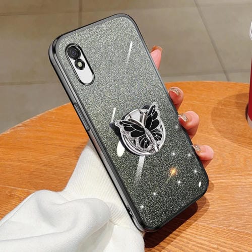 Para Redmi 9A Funda para Teléfono de TPU con Soporte de Mariposa con Brillo Degradado Plateado (Negro)