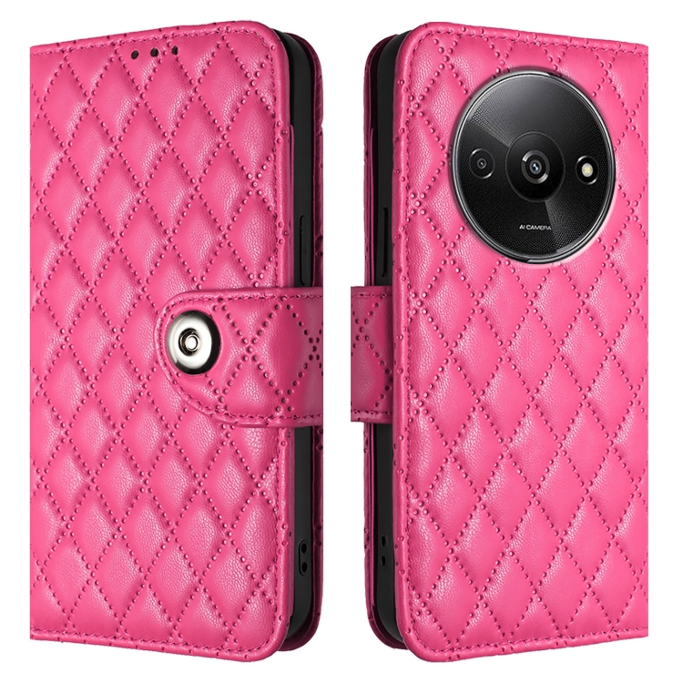 Para Redmi A3 Funda para Teléfono de Cuero con Tapa con Textura Rómbica y Cordón (Rojo Rosa)