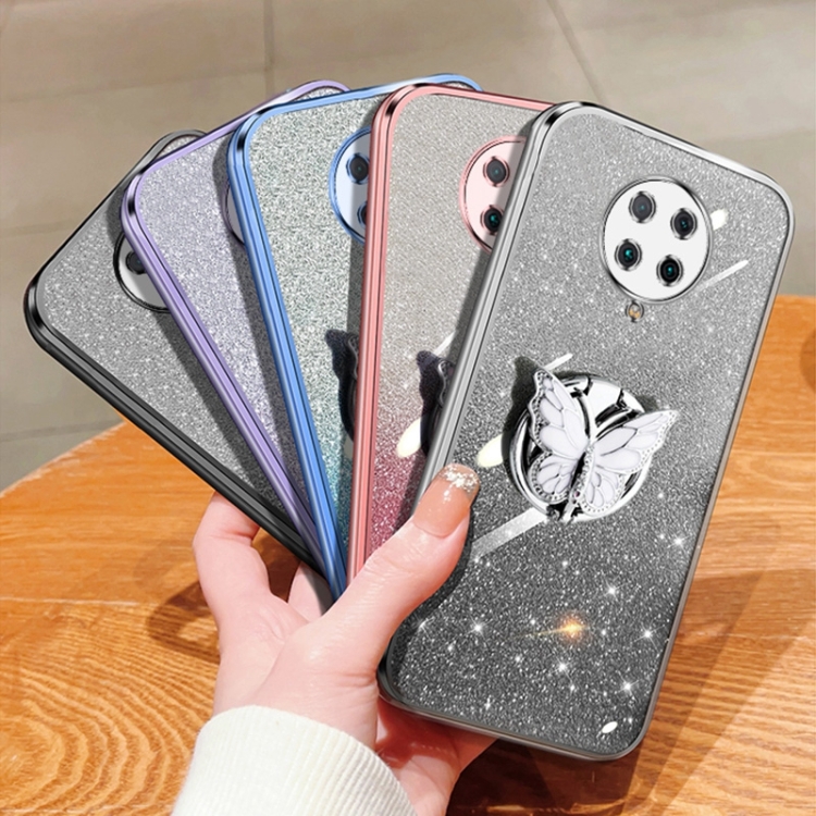 Para Redmi K30 Pro Funda para Teléfono de TPU con Soporte de Mariposa con Brillo Degradado Plateado (Rosa)