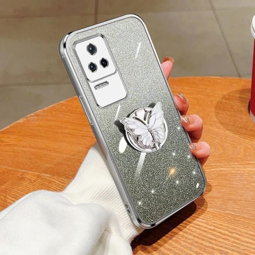 Para Redmi K40S Funda para Teléfono de TPU con Soporte de Mariposa con Brillo Degradado Plateado (Plata)
