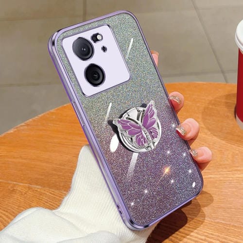 Para Redmi K60 Funda para Teléfono de TPU con Soporte de Mariposa con Brillo Degradado Ultra Plateado (Púrpura)