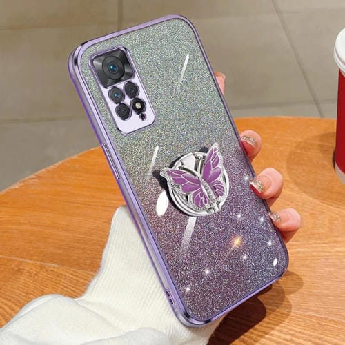 Para Redmi Note 11 Pro 4G Funda para Teléfono de TPU con Soporte de Mariposa con Brillo Degradado Plateado (Púrpura)