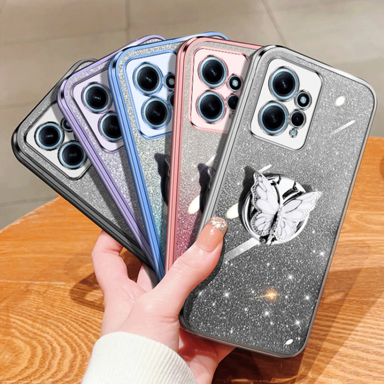 Para Redmi Note 12 4G Funda para Teléfono de TPU con Soporte de Mariposa con Brillo Degradado Global Plateado (Azul Sierra)