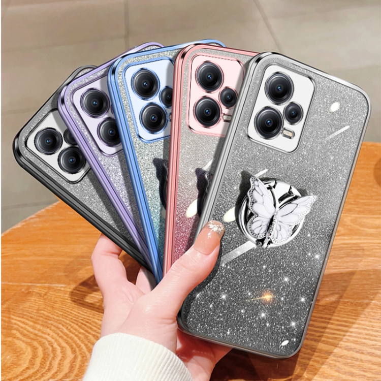 Para Redmi Note 12 5G Funda para Teléfono de TPU con Soporte de Mariposa con Brillo Degradado Global Plateado (Azul Sierra)