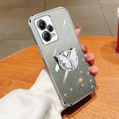 Para Redmi Note 12 5G Funda para Teléfono de TPU con Soporte de Mariposa con Brillo Degradado Plateado Global (Plateado)