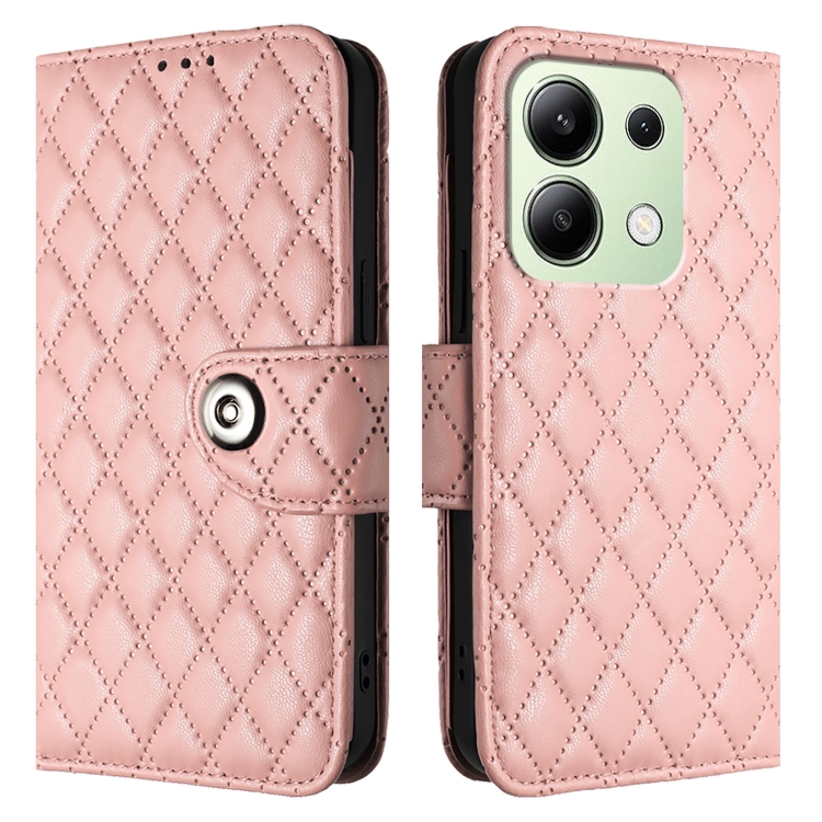 Para Redmi Note 13 4G Funda para Teléfono de Cuero con Tapa con Textura Rómbica Global y Cordón (Rosa Coral)