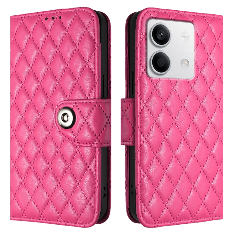Para Redmi Note 13 5G Funda para Teléfono de Cuero con Tapa con Textura Rómbica Global y Cordón (Rojo Rosa)