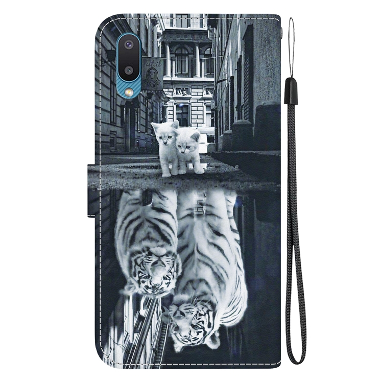 Funda para Teléfono Samsung Galaxy A02 / M02 Cuero Dibujo Coloreado Textura Cristal Indio (Reflejo Tigre Gato)