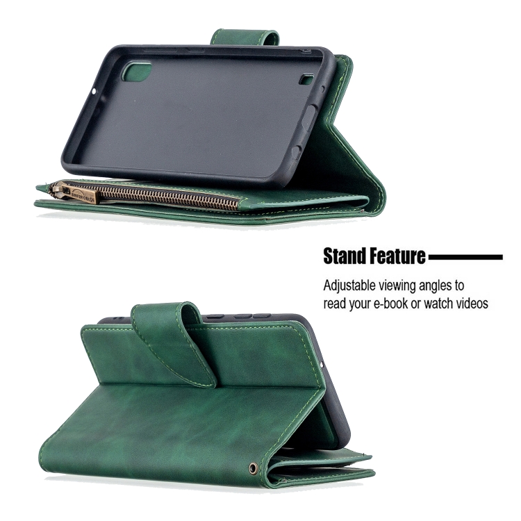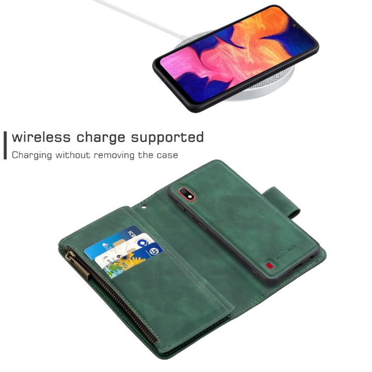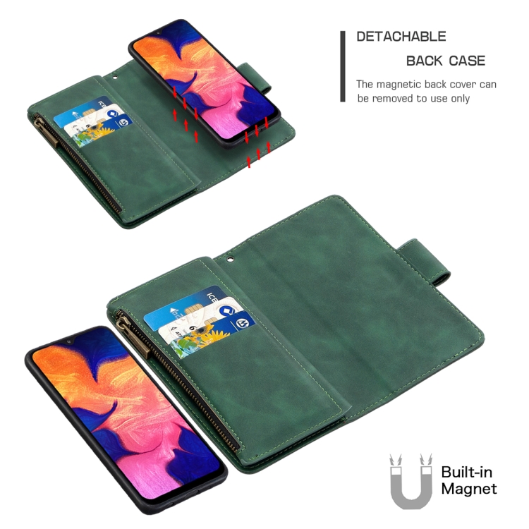 Funda Cuero PU Samsung Galaxy A10 M10 Skin Feel Cremallera Magnética Tapa Horizontal Ranuras Tarjetas Soporte Billetera Marco Fotos Cordón (Verde)