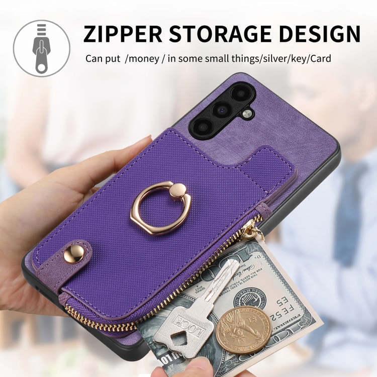 Funda para Teléfono Samsung Galaxy A14 4G 5G con Anillo Cuero Cruzado Cremallera Vertical y Billetera (Púrpura)