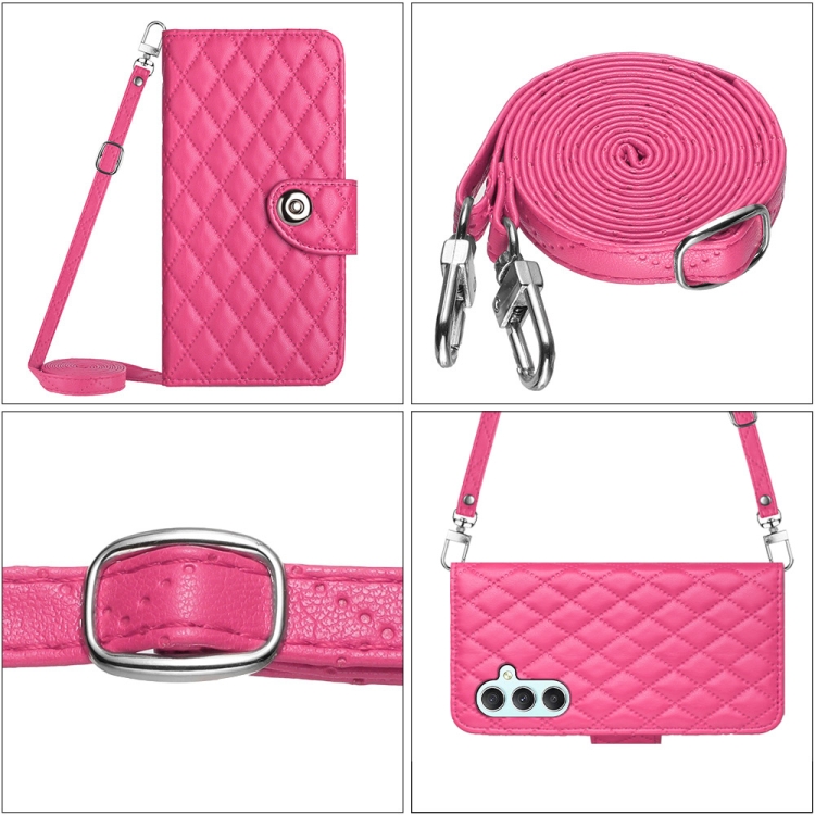 Funda para Teléfono Samsung Galaxy A14 4G y 5G con Tapa de Cuero Textura Rómbica y Cordón Largo (Rojo Rosa)