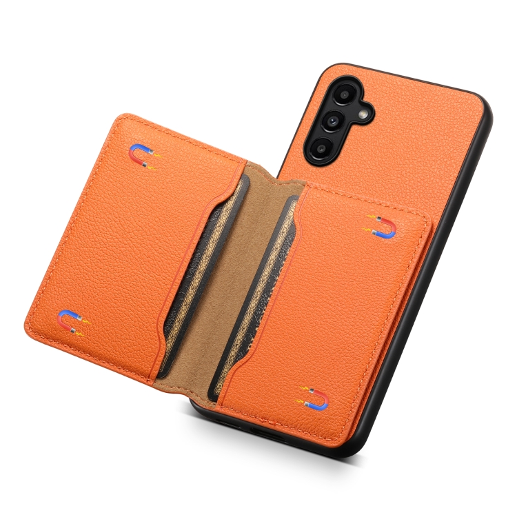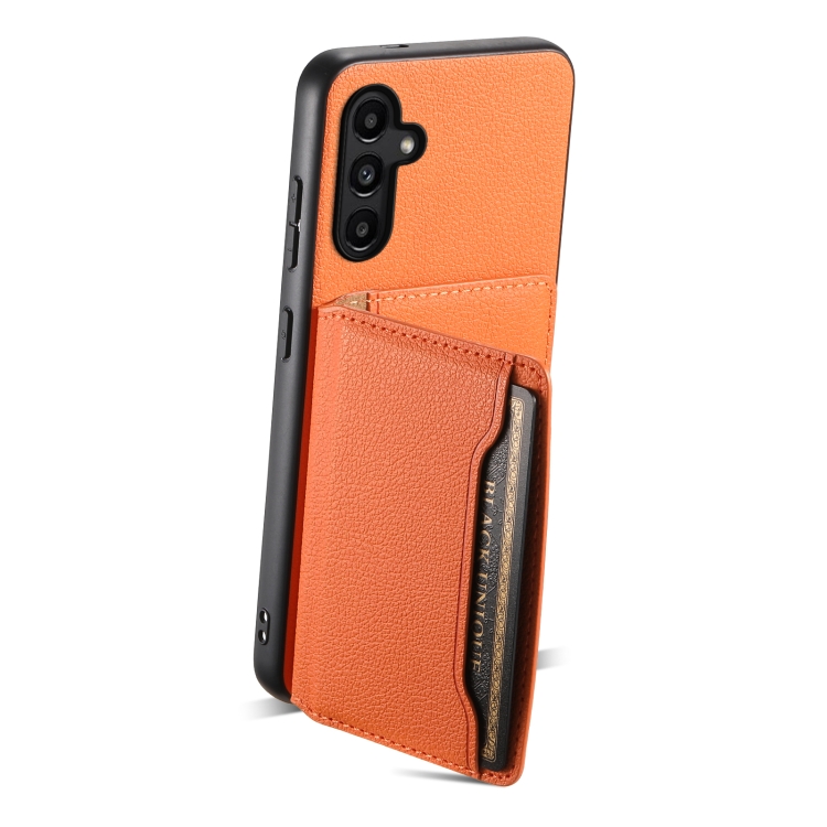 Funda para Teléfono Samsung Galaxy A14 con Diseño de Bolsa para Tarjetas con Textura de Becerro (Naranja)