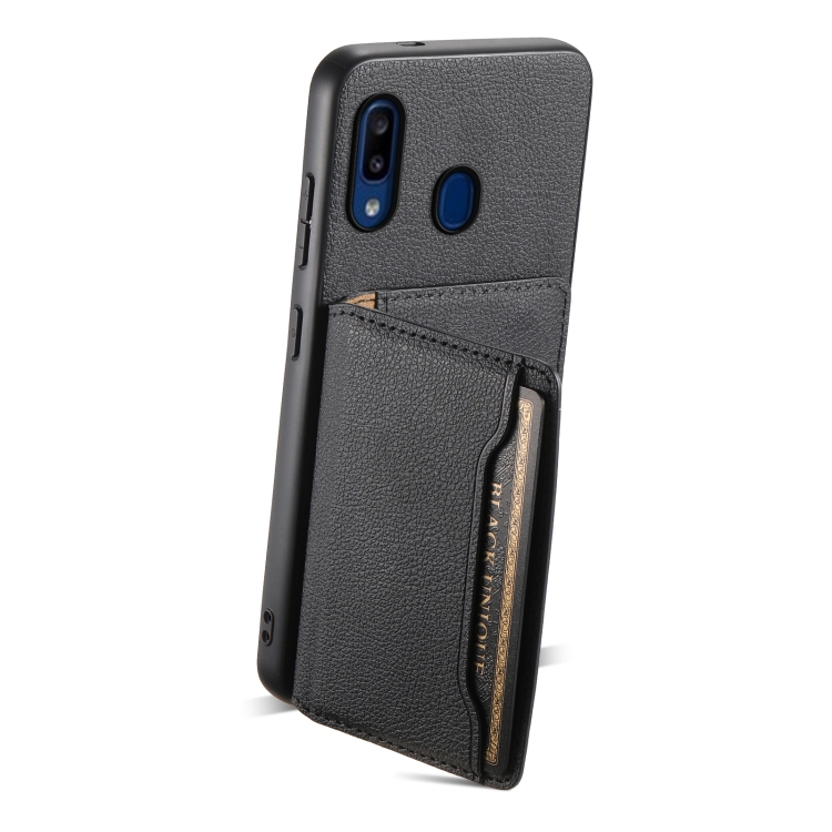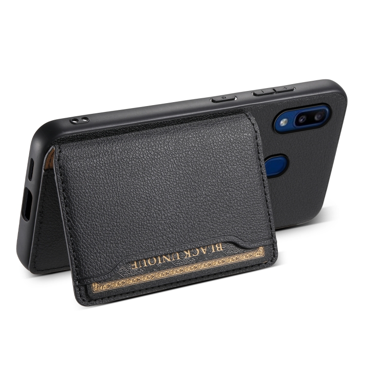 Estuche para teléfono Samsung Galaxy A20 A30 con diseño bolsa para tarjetas textura de pantorrilla (Negro)