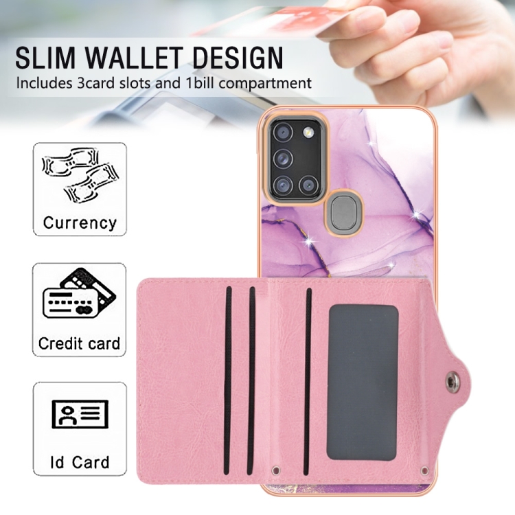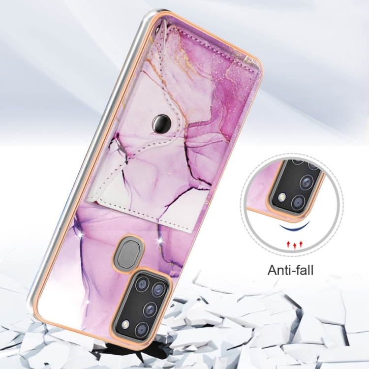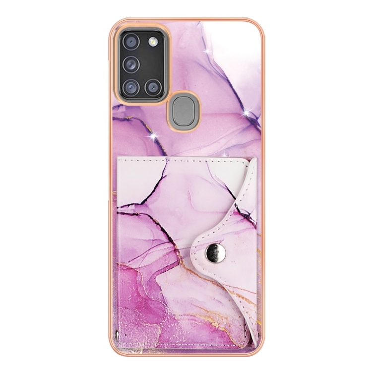 Estuche para Teléfono Samsung Galaxy A21S con Ranura para Tarjeta Imd y Patrón de Mármol (Oro Rosa Púrpura)