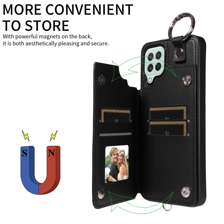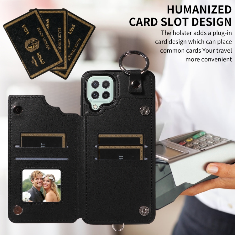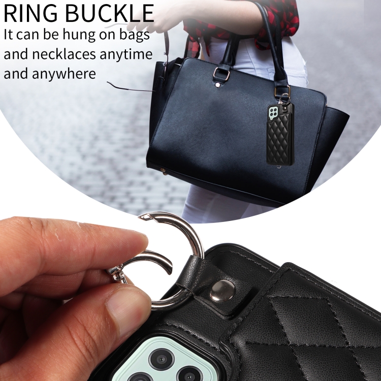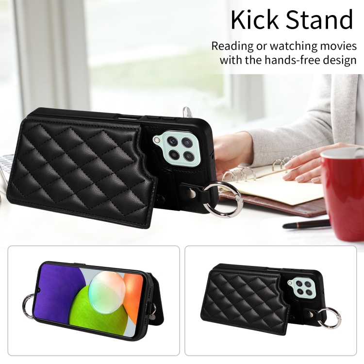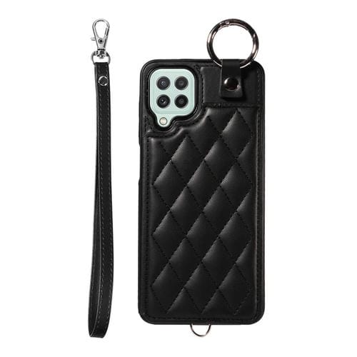 Estuche para Teléfono Samsung Galaxy A22 4G con Bolsa para Tarjetas Textura Rómbica y Cordón Corto (Negro)