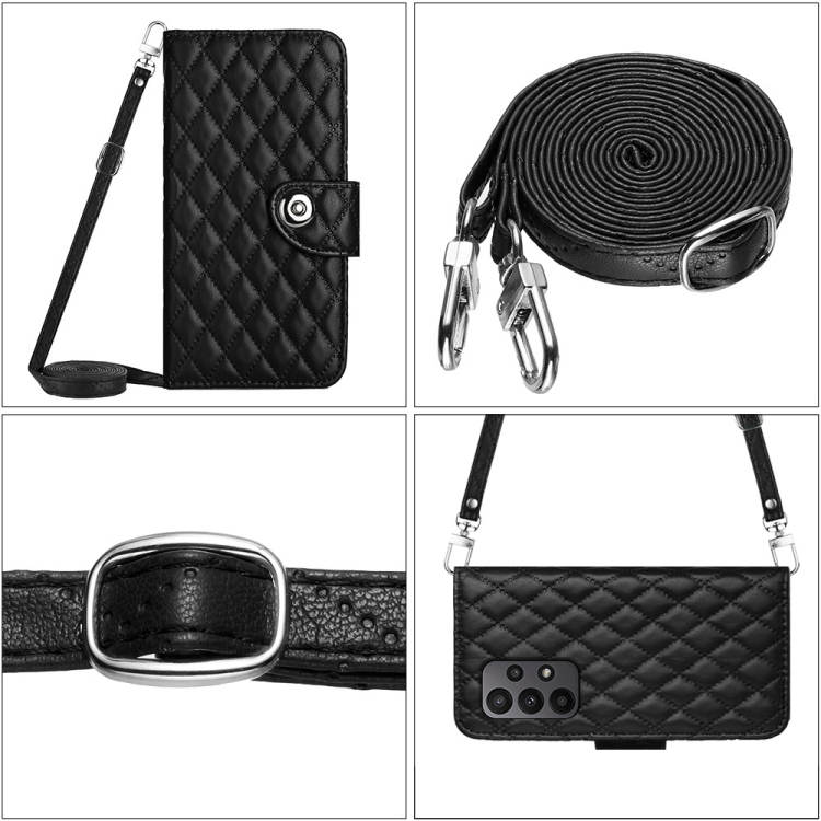 Funda para Teléfono Samsung Galaxy A23 4G F23 5G con Tapa de Cuero Textura Rómbica y Cordón Largo (Negro)