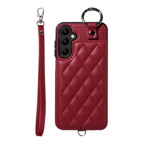 Estuche para Teléfono Samsung Galaxy A24 4G con Bolsa para Tarjetas Textura Rómbica y Cordón Corto (Rojo Vino)