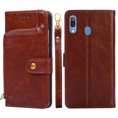 Bolsa de Cremallera para Samsung Galaxy A30 (Japón Ver.) Caja de Cuero con Volteador Horizontal Soporte Ranuras para Tarjetas y Cordón (Marrón)