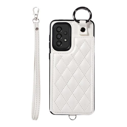 Estuche para Teléfono Samsung Galaxy A33 5G con Bolsa para Tarjetas Textura Rómbica y Cordón Corto (Blanco)