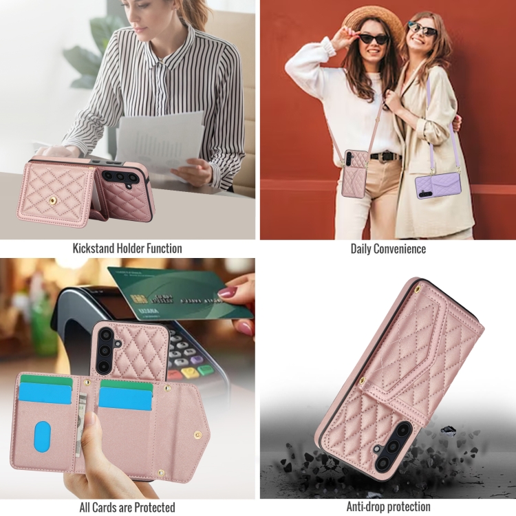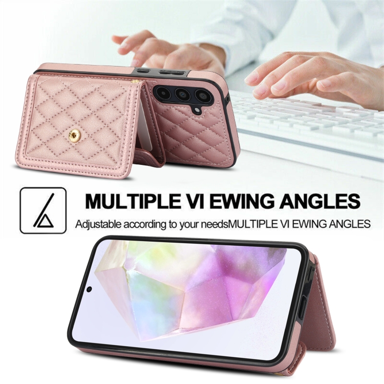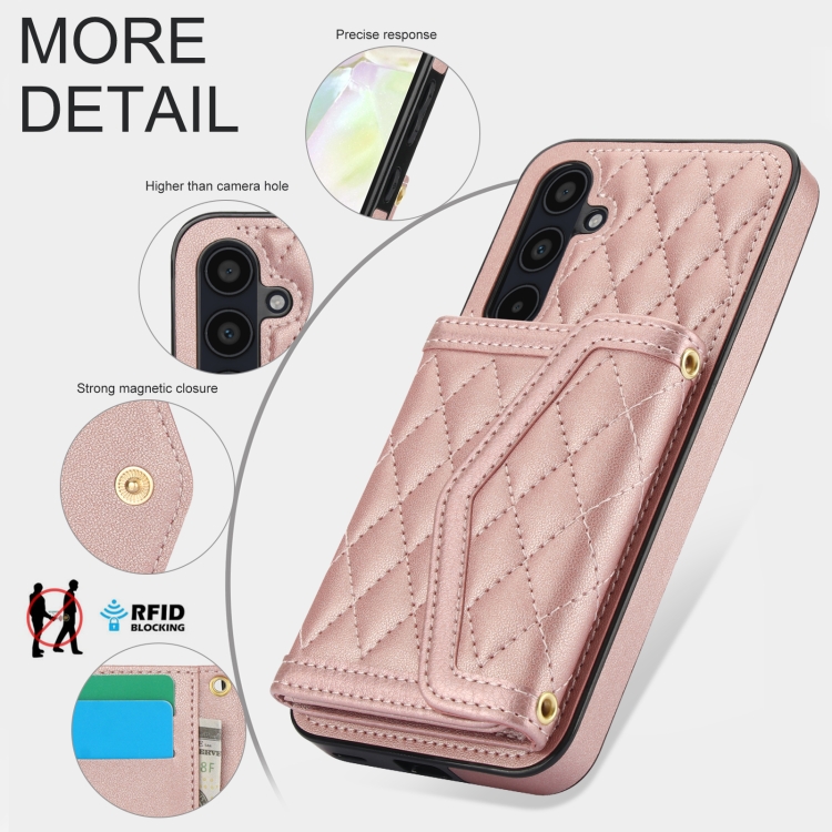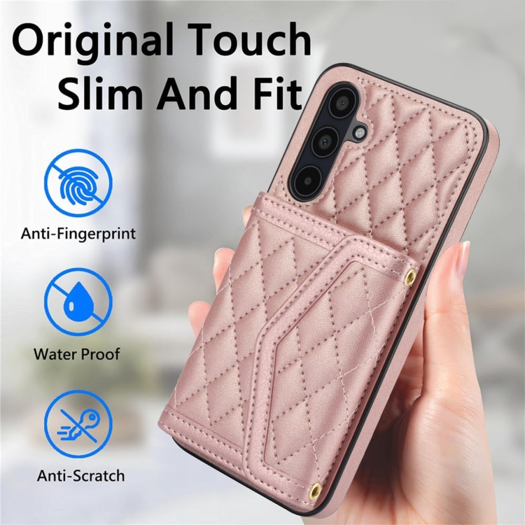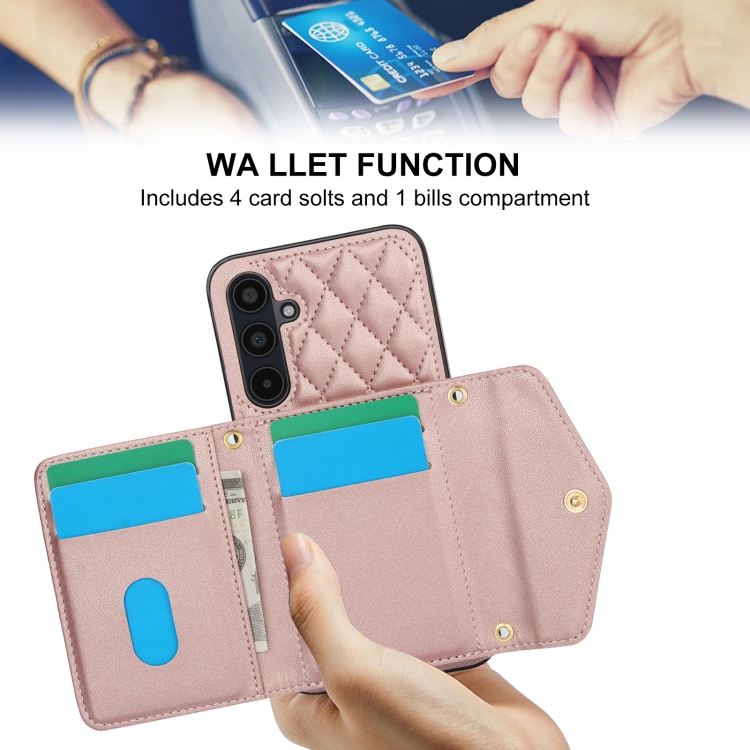 Estuche para Teléfono Samsung Galaxy A35 5G con Bolsa para Tarjetas Textura Rómbica Empalme y Cordón Largo (Oro Rosa)