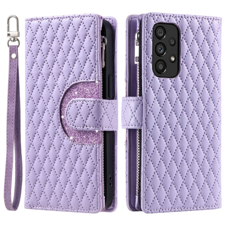 Estuche de Cuero Samsung Galaxy A53 5G con Billetera, Cremallera y Celosía con Purpurina (Púrpura)