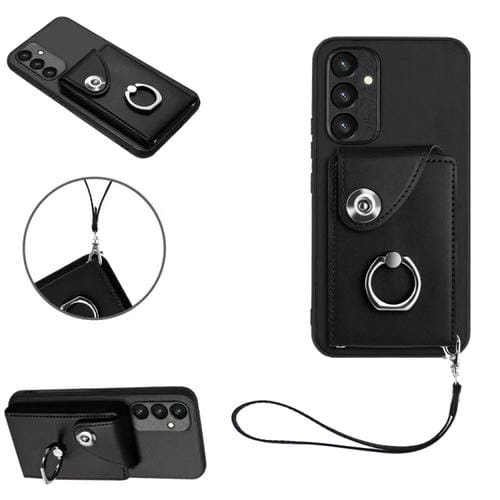 Funda para Teléfono Samsung Galaxy A54 5G de PU con Soporte para Anillo y Bolsa para Tarjeta con Cordón (Negro)