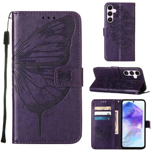 Funda de Cuero para Samsung Galaxy A55 con Mariposa en Relieve (Púrpura Oscuro)