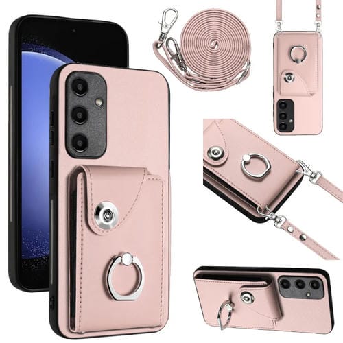 Funda para teléfono Samsung Galaxy A55 con soporte para anillo y bolsa para tarjeta con cordón largo (Rosa)