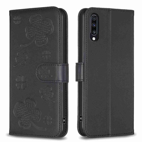 Funda para Samsung Galaxy A70 Cuero Relieve Cuatro Hojas (Negro)