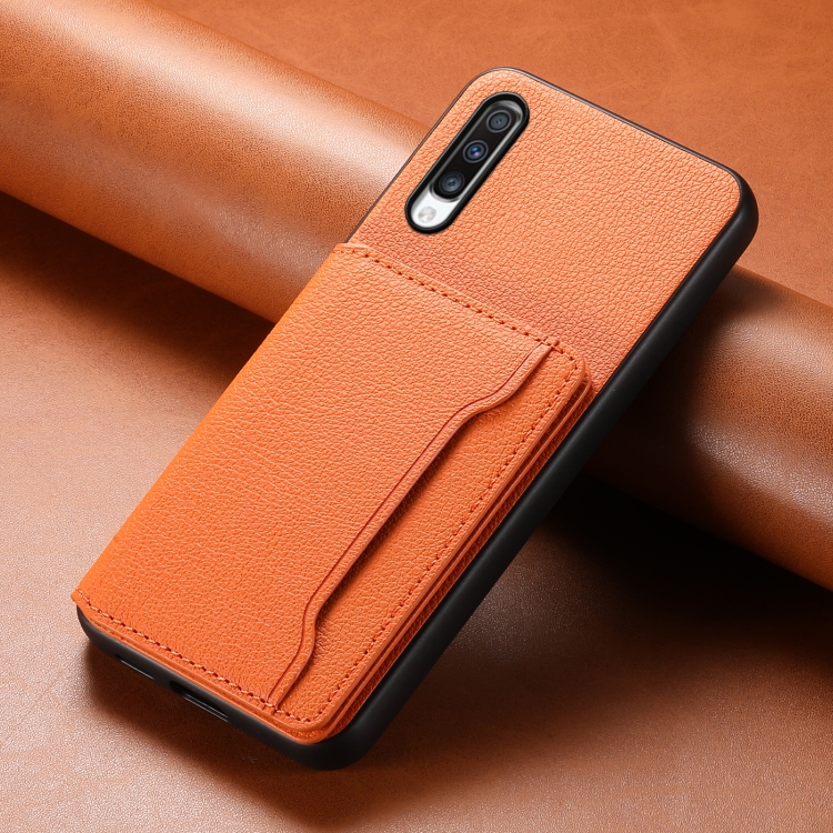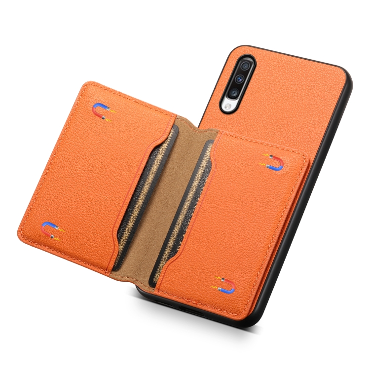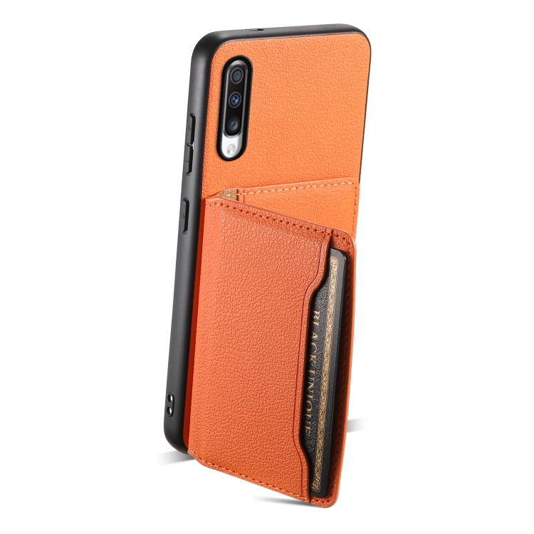 Funda para Teléfono Samsung Galaxy A70 Diseño Bolsa para Tarjetas Textura Becerro (Naranja)