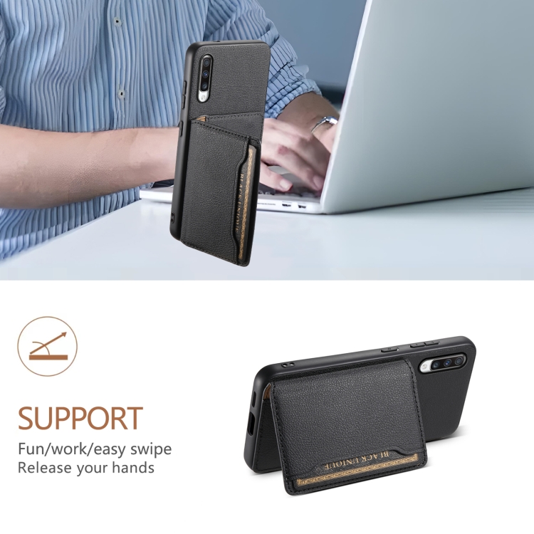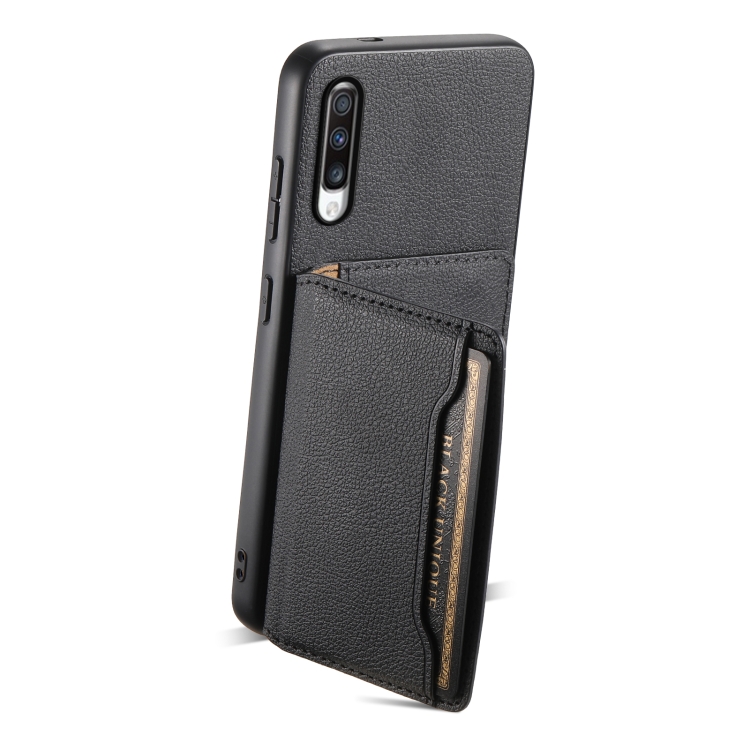 Funda para Teléfono Samsung Galaxy A70 Diseño Bolsa para Tarjetas Textura de Becerro (Negro)