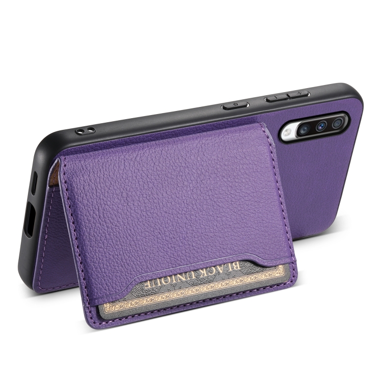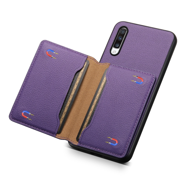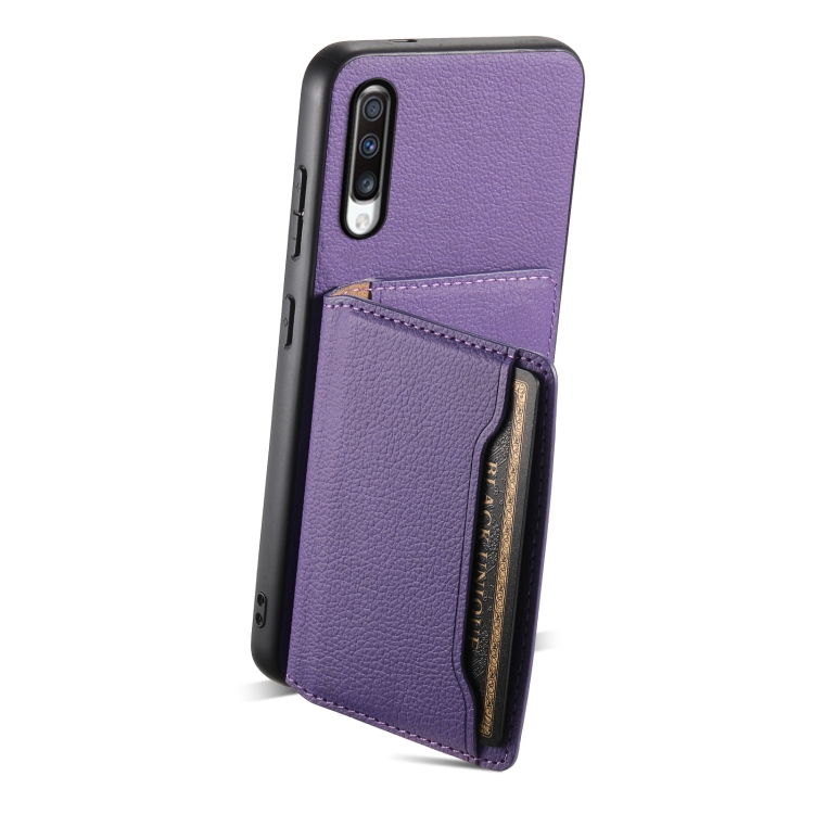 Funda para Teléfono Samsung Galaxy A70 Diseño Bolsa para Tarjetas Textura de Becerro (Púrpura)