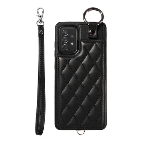Estuche para Teléfono Samsung Galaxy A72 4G / 5G con Bolsa para Tarjetas Textura Rómbica y Cordón Corto (Negro)