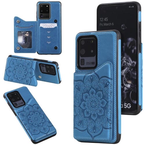 Estuche protector Samsung Galaxy S20 Eltra con patrón flor en relieve soporte y ranuras para tarjetas (Azul)