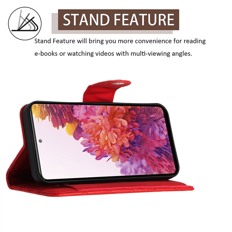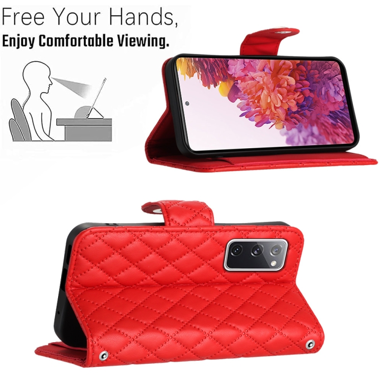 Estuche para Teléfono Samsung Galaxy S20 FE con Tapa de Cuero Textura Rómbica y Cordón Largo (Rojo)
