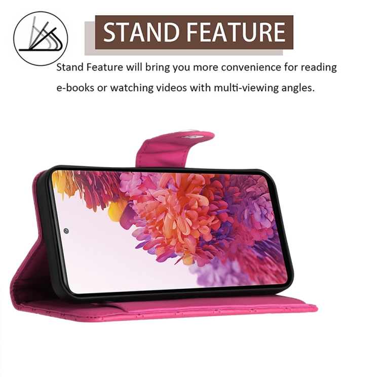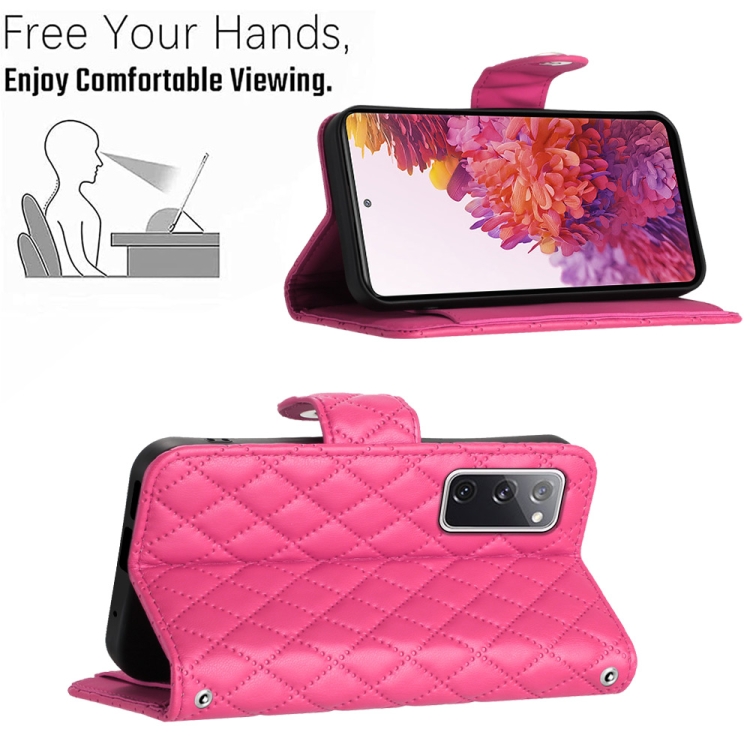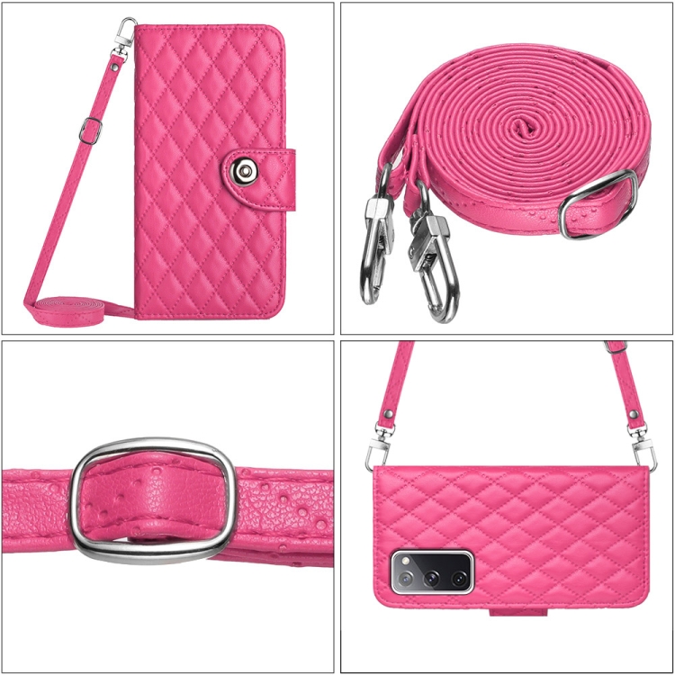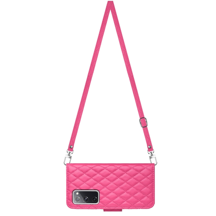 Funda para teléfono Samsung Galaxy S20 FE con tapa de cuero textura rómbica y cordón largo (Rojo Rosa)