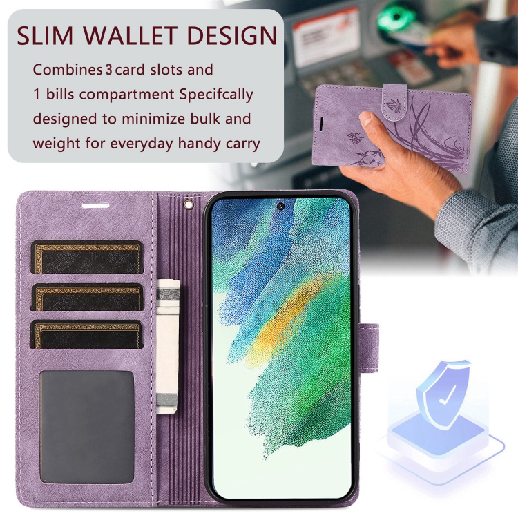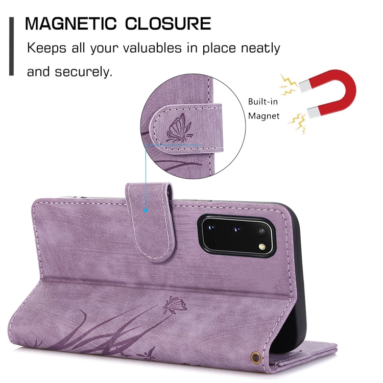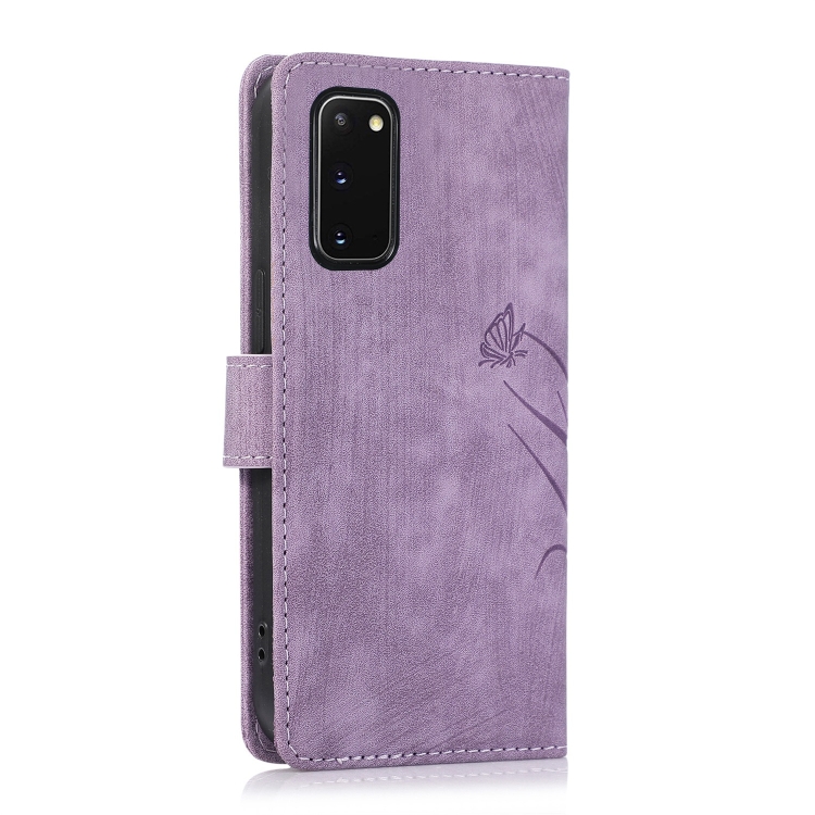 Funda de Cuero Samsung Galaxy S20 con Relieve de Mariposa Orquídea (Púrpura)