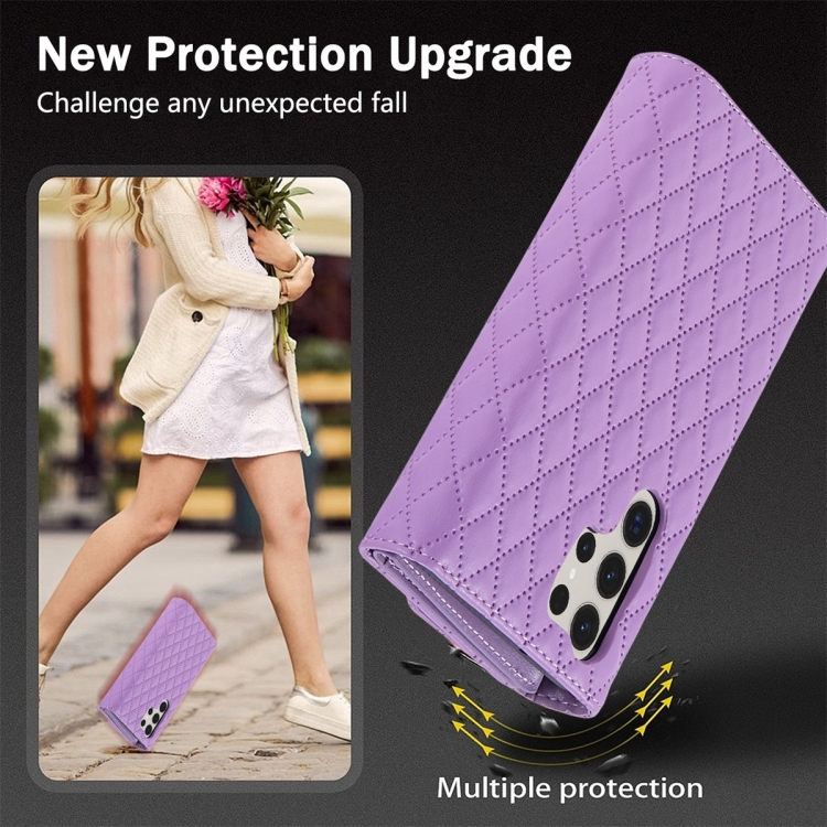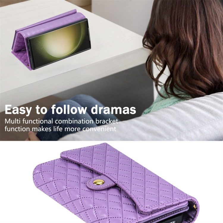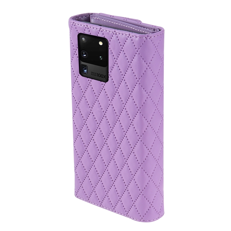 Estuche para teléfono Samsung Galaxy S20 Ultra con billetera de múltiples tarjetas con cremallera y cuero rómbico (Púrpura)