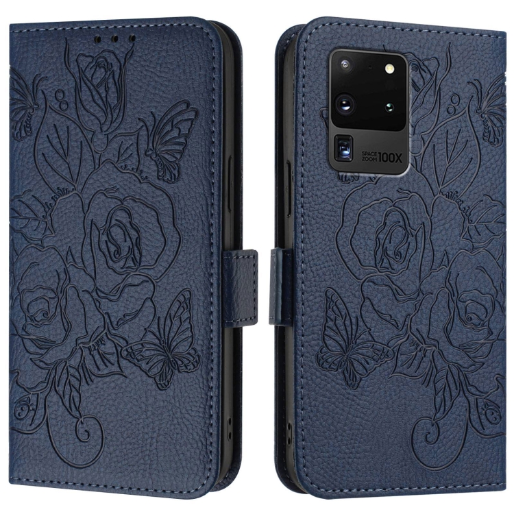Estuche para teléfono Samsung Galaxy S20 Ultra cuero antirrobo RFID con rosa en relieve (Azul Oscuro)