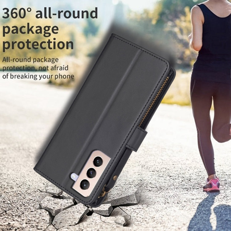 Para Samsung Galaxy S21+ 5G 9 Ranuras para tarjetas Cremallera Cartera Funda de cuero con tapa para teléfono (Negro)