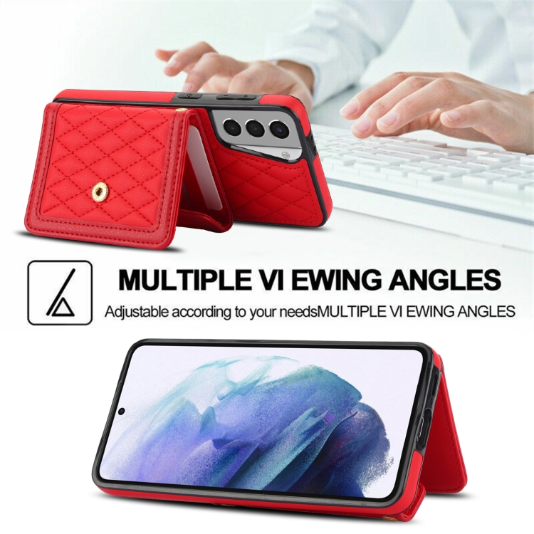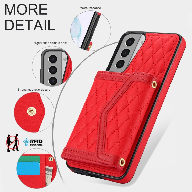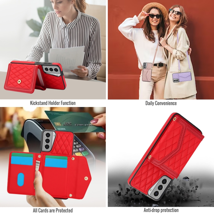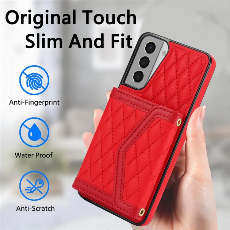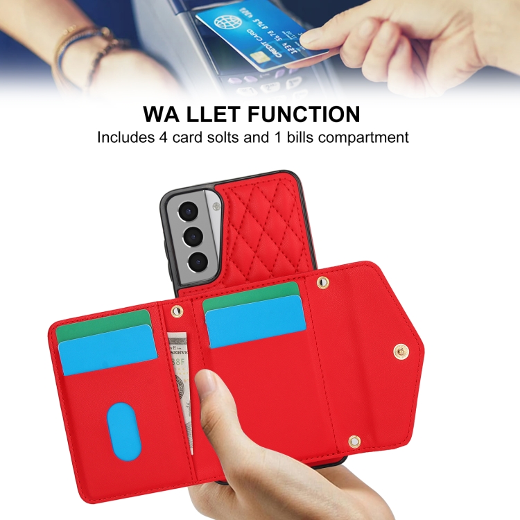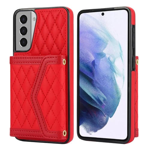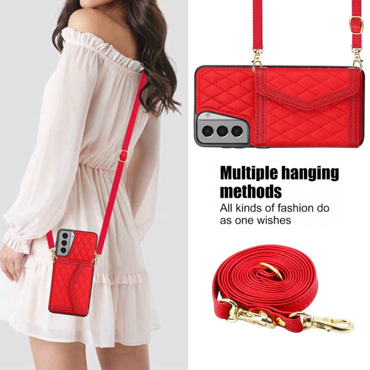 Estuche para Teléfono Samsung Galaxy S21 5G con Bolsa para Tarjeta Textura Rómbica y Cordón Largo (Rojo)