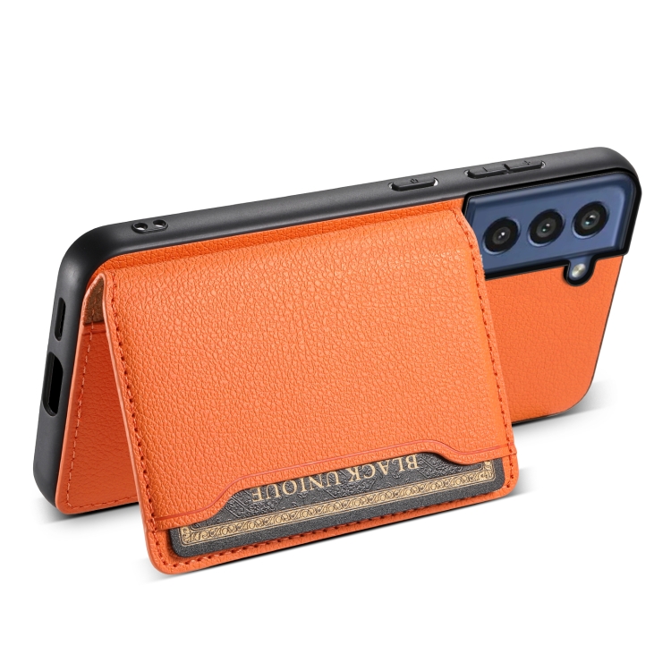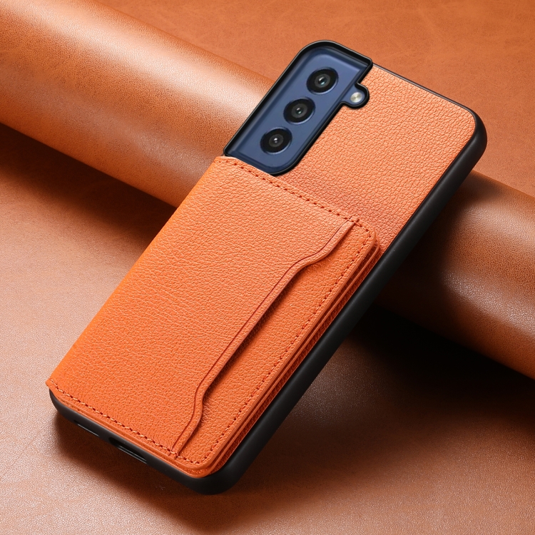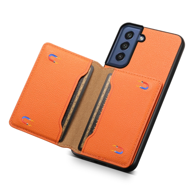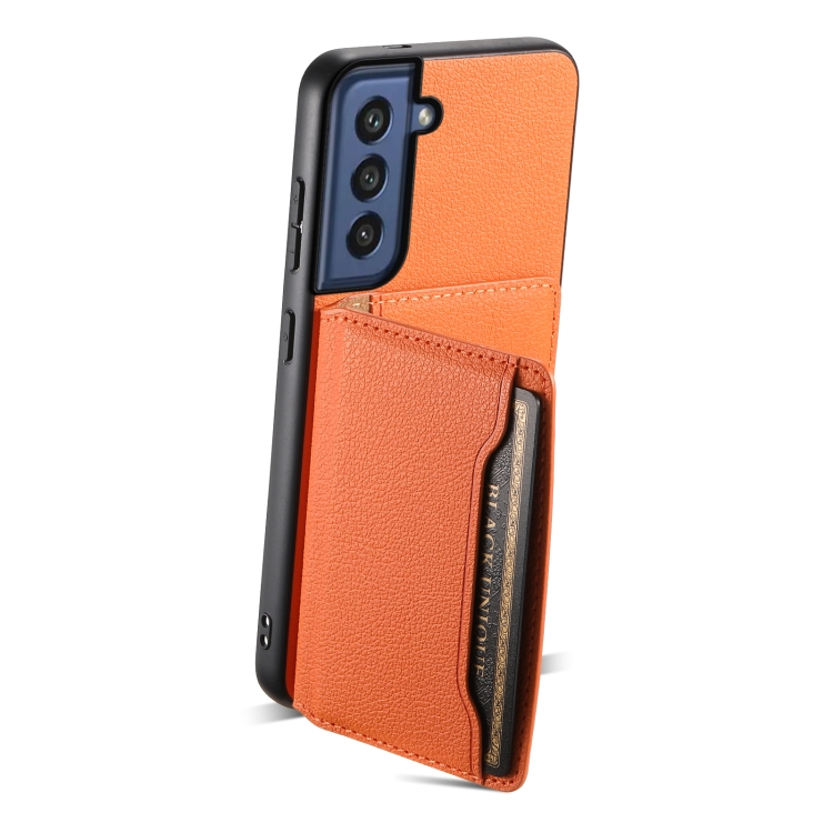 Estuche para Teléfono Samsung Galaxy S21 FE 5G con Diseño de Bolsa para Tarjetas y Textura de Becerro (Naranja)