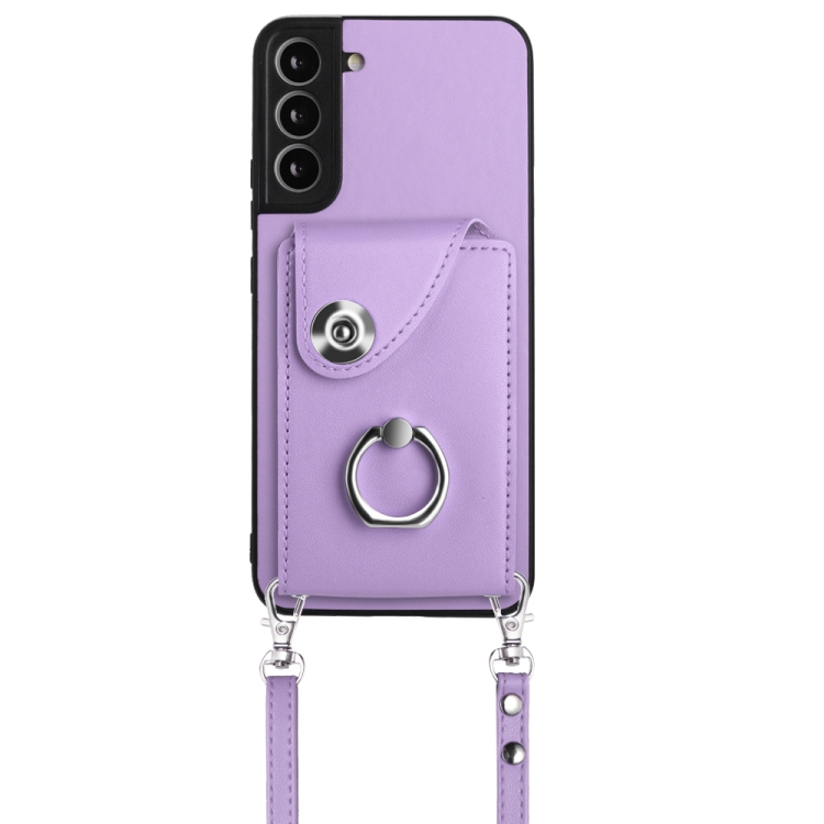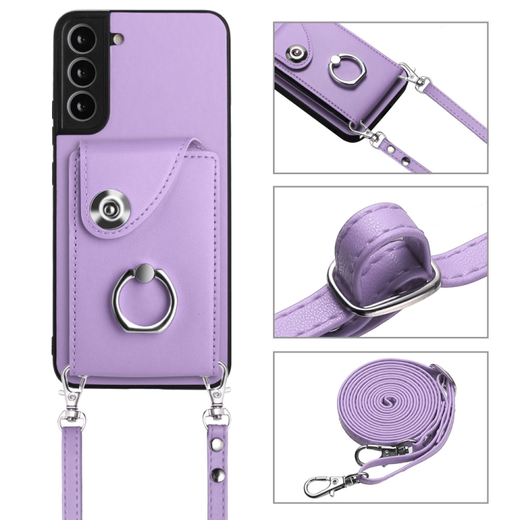Funda para Teléfono Samsung Galaxy S21 FE 5G con Soporte para Anillo y Bolsa para Tarjeta con Cordón Largo (Púrpura)
