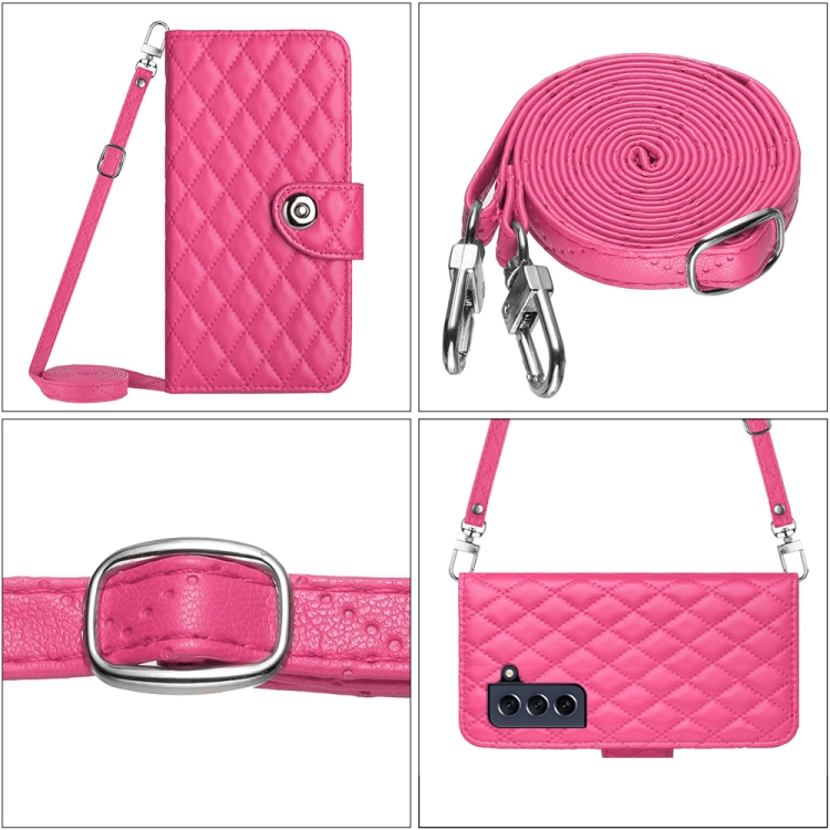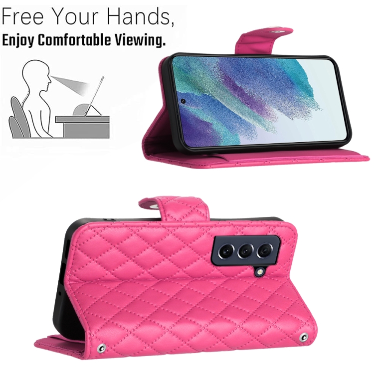 Funda para teléfono Samsung Galaxy S21 FE 5G con tapa de cuero textura romboidal y cordón largo (Rojo Rosa)