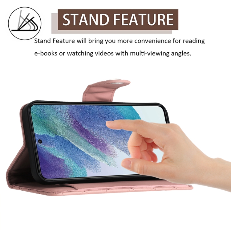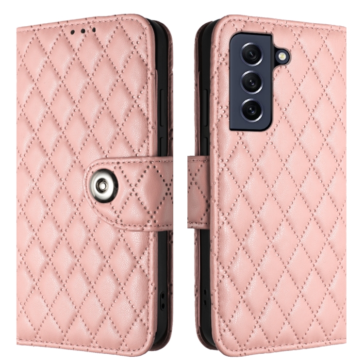 Funda para teléfono Samsung Galaxy S21 FE 5G con tapa de cuero textura romboidal y cordón (Rosa Coral)