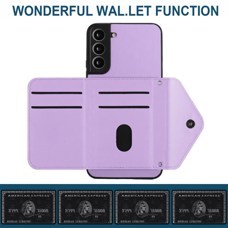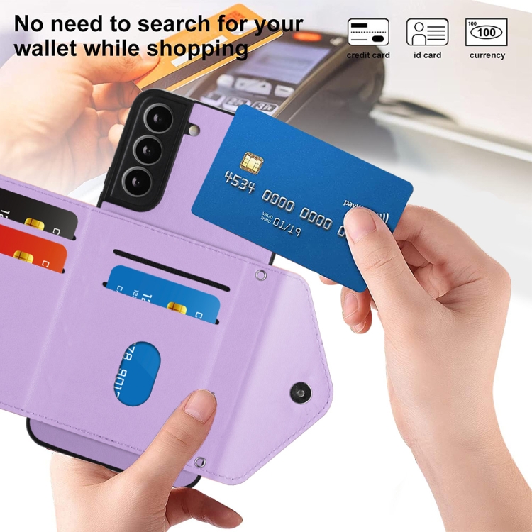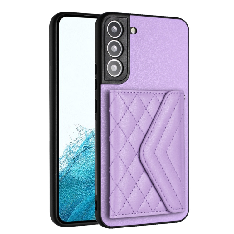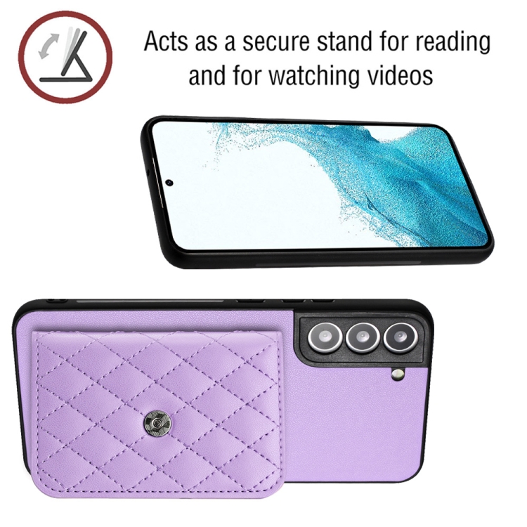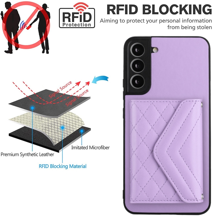 Bolsa para Tarjetas Samsung Galaxy S21 FE Textura Rómbica Estuche Teléfono Rfid Cordón Largo (Púrpura Claro)