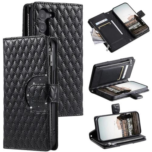Estuche para Teléfono Samsung Galaxy S23 + 5G Cuero Billetera Cremallera Celosía Purpurina (Negro)