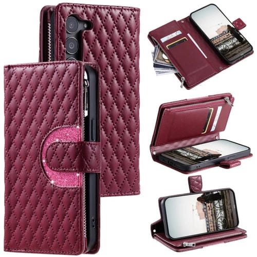 Estuche para teléfono Samsung Galaxy S23+ 5G cuero con billetera y cremallera celosía purpurina (Rojo Vino)