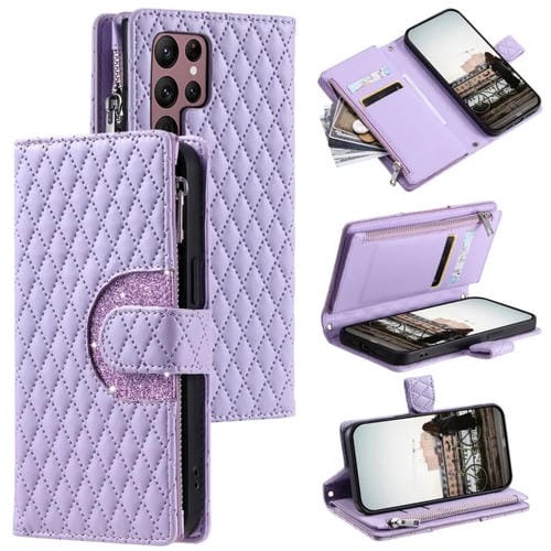 Estuche para Teléfono Samsung Galaxy S24 Ultra 5G Cuero con Billetera, Cremallera y Celosía con Purpurina (Púrpura)